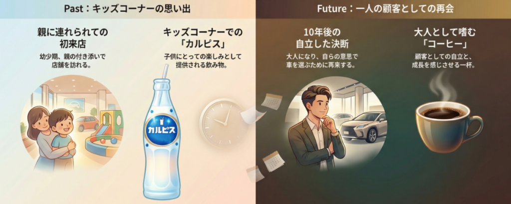かつて親に連れられて来店し、キッズコーナーでカルピスを飲んでいた子が、10年後に大人になって自らの意思で車を選び、コーヒーを飲む大人として戻ってくる。PSLを導入し、トータルカーライフサポートを完遂した先には、そんな世代を超えて愛される組織の景色が待っています。